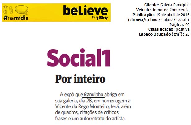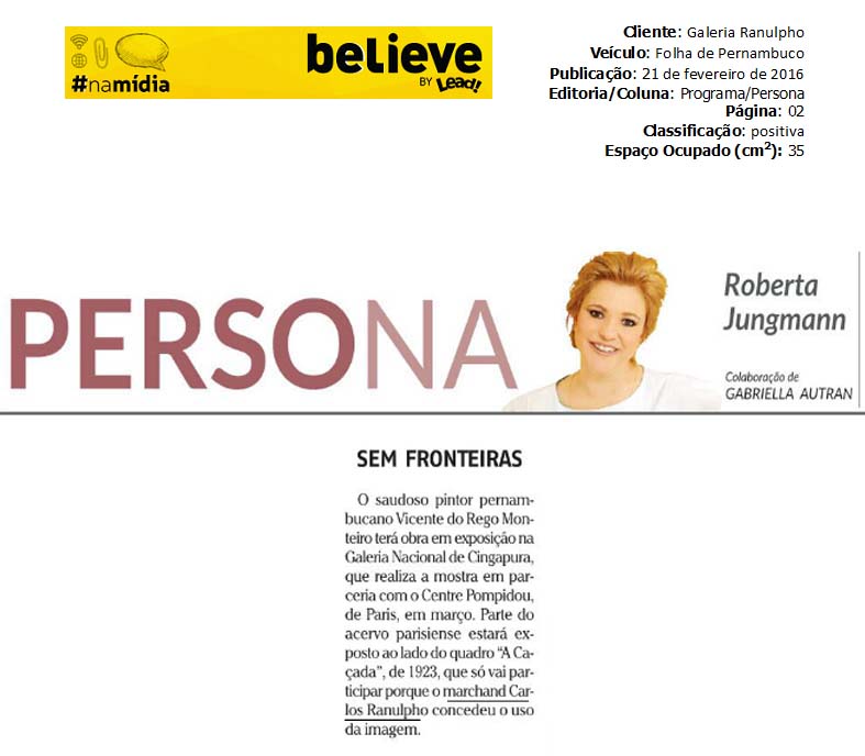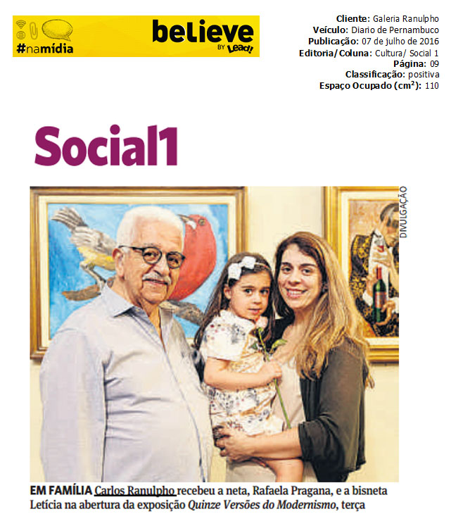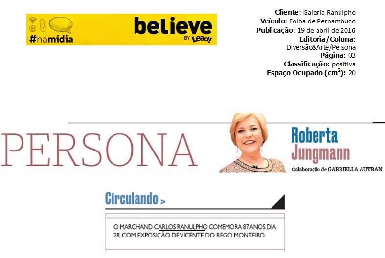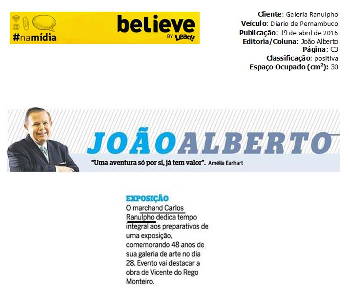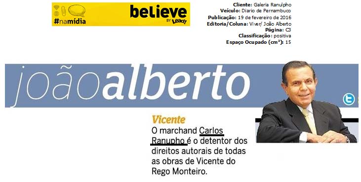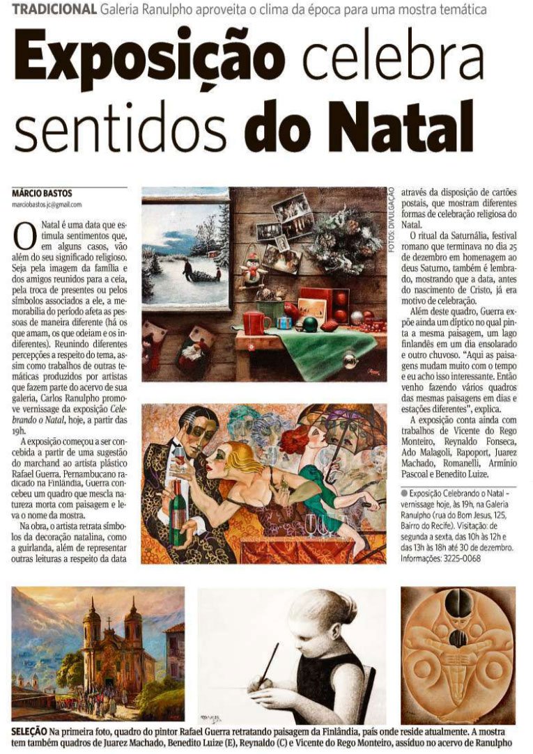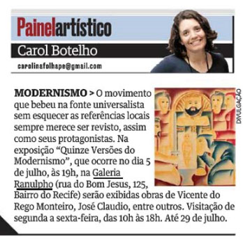 No próximo dia 28, o marchand Carlos Ranulpho abre as portas da sua Galeria Ranulpho para comemorar seus 87 anos e os 48 anos do espaço de artes. Na ocasião, ele vai receber amigos e inaugurar uma exposição em homenagem a Vicente do Rego Monteiro. As telas da mostra são todas de grandes formatos (mais de 1m²). Além dos quadros, citações de críticos e algumas frases e um autorretrato do artista vão integrar a expô.